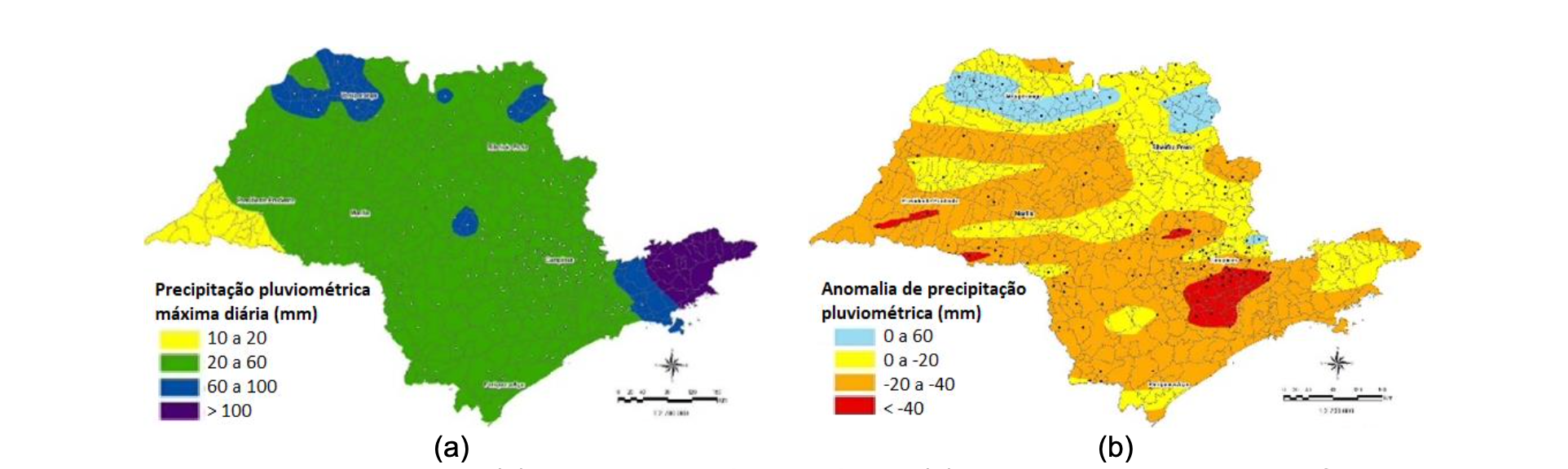 Contudo, algumas regiões, junto ao Médio Paranapanema, Vale do Ribeira, São José dos Dourados e Turvo Grande e Alto Paranapanema, apresentaram valores negativos, o que pode ser explicado por duas razões principais, variabilidade espacial da precipitação,