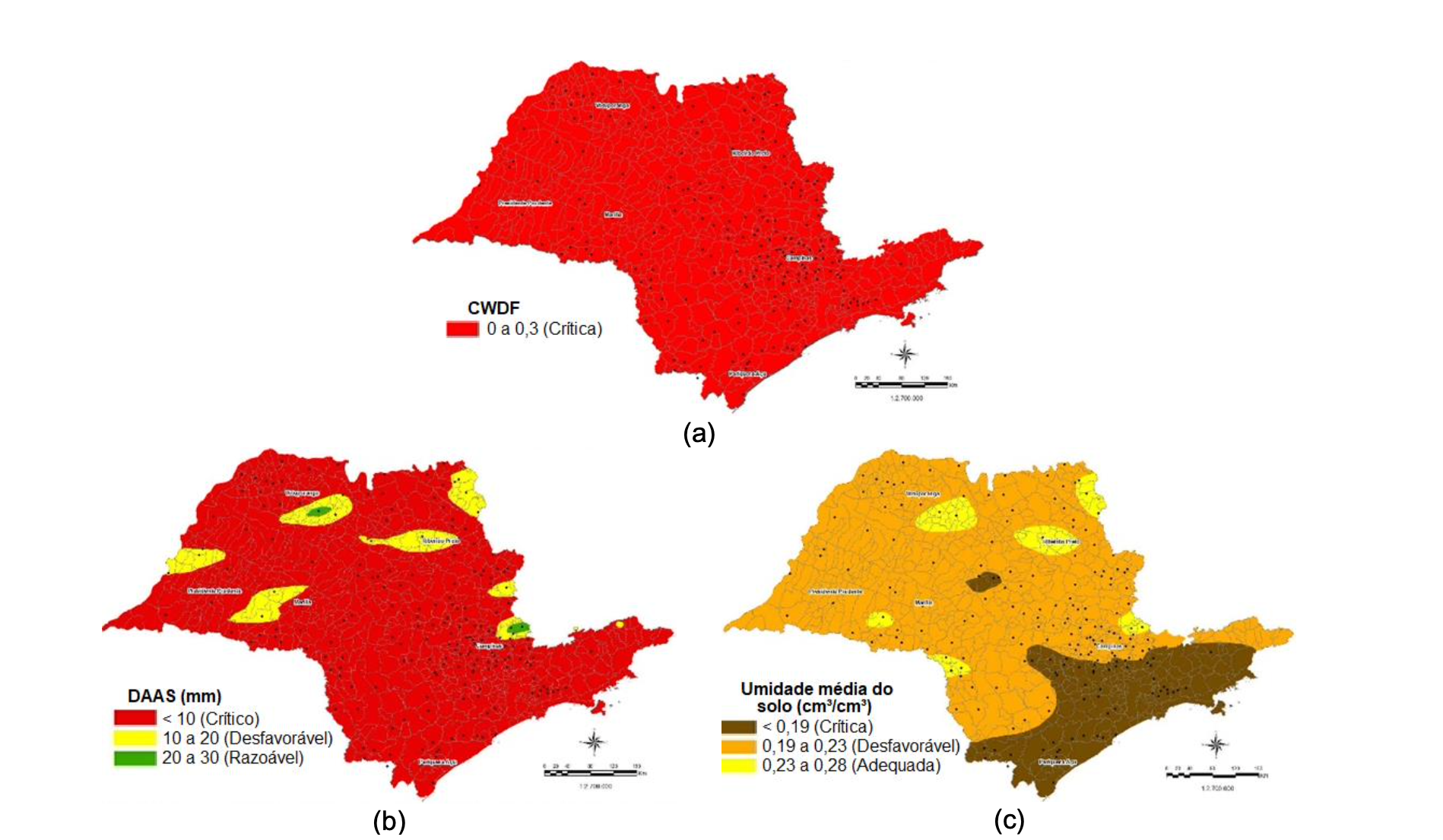 Conforme trabalho de Rolim (2003) e Brunini et al. (2003) com base no programa INFOSECA, foi estimada uma relação entre água disponível no solo e o desenvolvimento das culturas, baseando-se nas relações de Evapotranspiração Real (ETR), Água no solo, e Evapotranspiração Potencial (ETP), podendo-se estimar se as culturas estão sendo adequadamente supridas pela água do solo e atendendo à demanda climática, apresentado como crítico os últimos 3 dias de fevereiro (Figura 7a). Estas restrições são também apresentadas pela água disponível no solo (Figuras 7b), destacando-se que ao final de fevereiro, encontravam-se condições desfavoráveis às culturas, com alta restrição de umidade, conforme estimativa da umidade média do solo (Figura 7c).