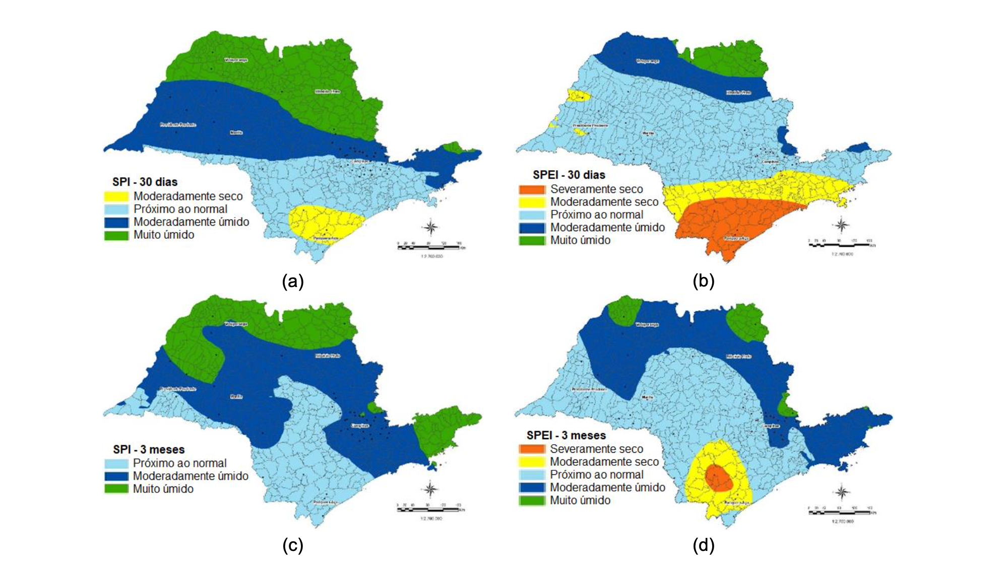 Os meses de dezembro a fevereiro são caracterizados como meses úmidos, onde somente com um alto volume de precipitação pode indicar condições climáticas úmidas, mas que não refletem necessariamente o estado atual de reserva hídrica em reservatórios e mesmo necessidade de suprimento humano, animal e irrigação de culturas, sem considerar- se ainda a necessidade de geração de energia. O Índice Padronizado de Precipitação (SPI) e o Índice Padronizado de Precipitação e Evapotranspiração (SPEI), quando utilizados em