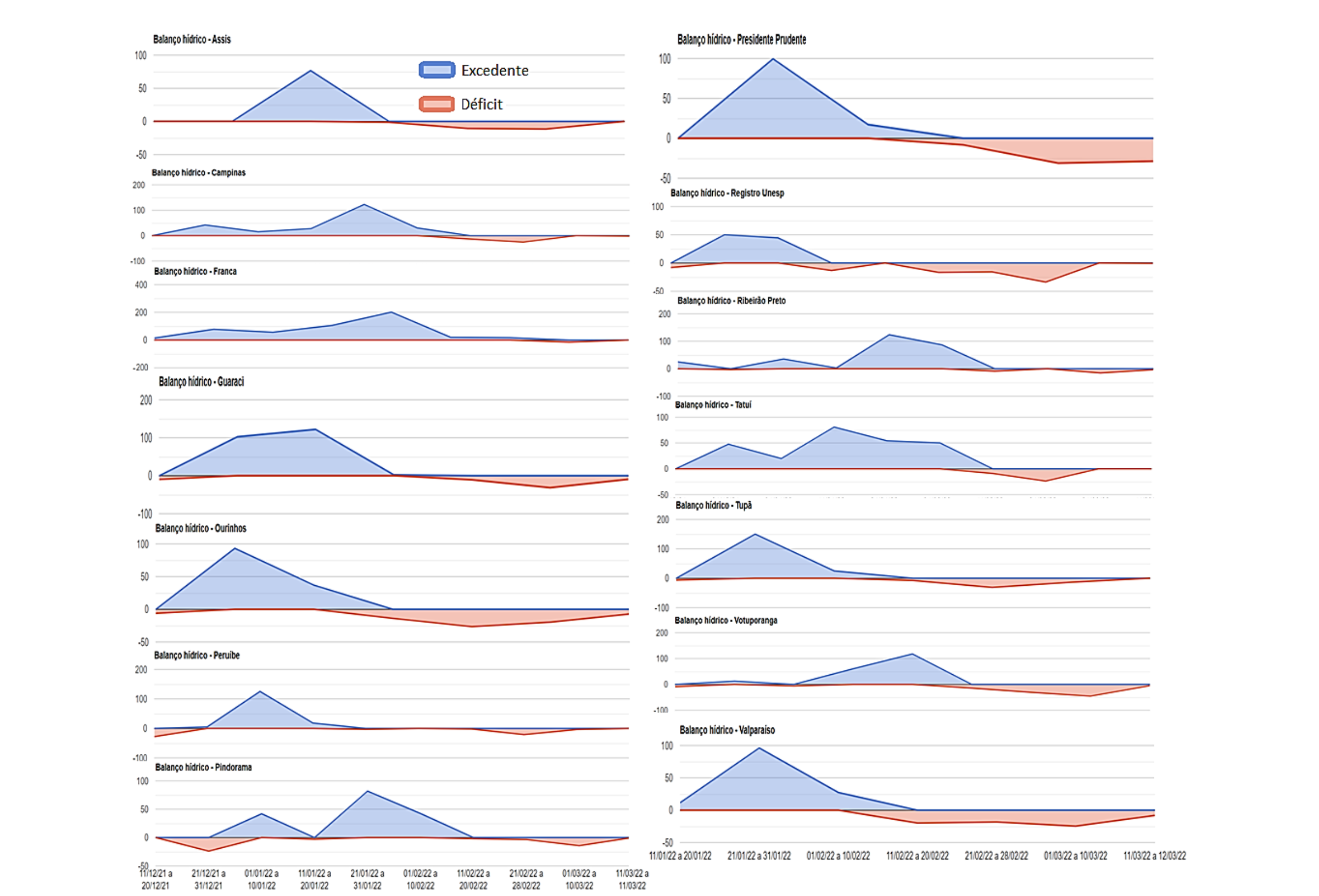 Figura 8 - Analise temporal do balanço hídrico em escala decendial para diversas localidades do Estado de São Paulo, no período 1 de janeiro a 11 de março de 2022.
