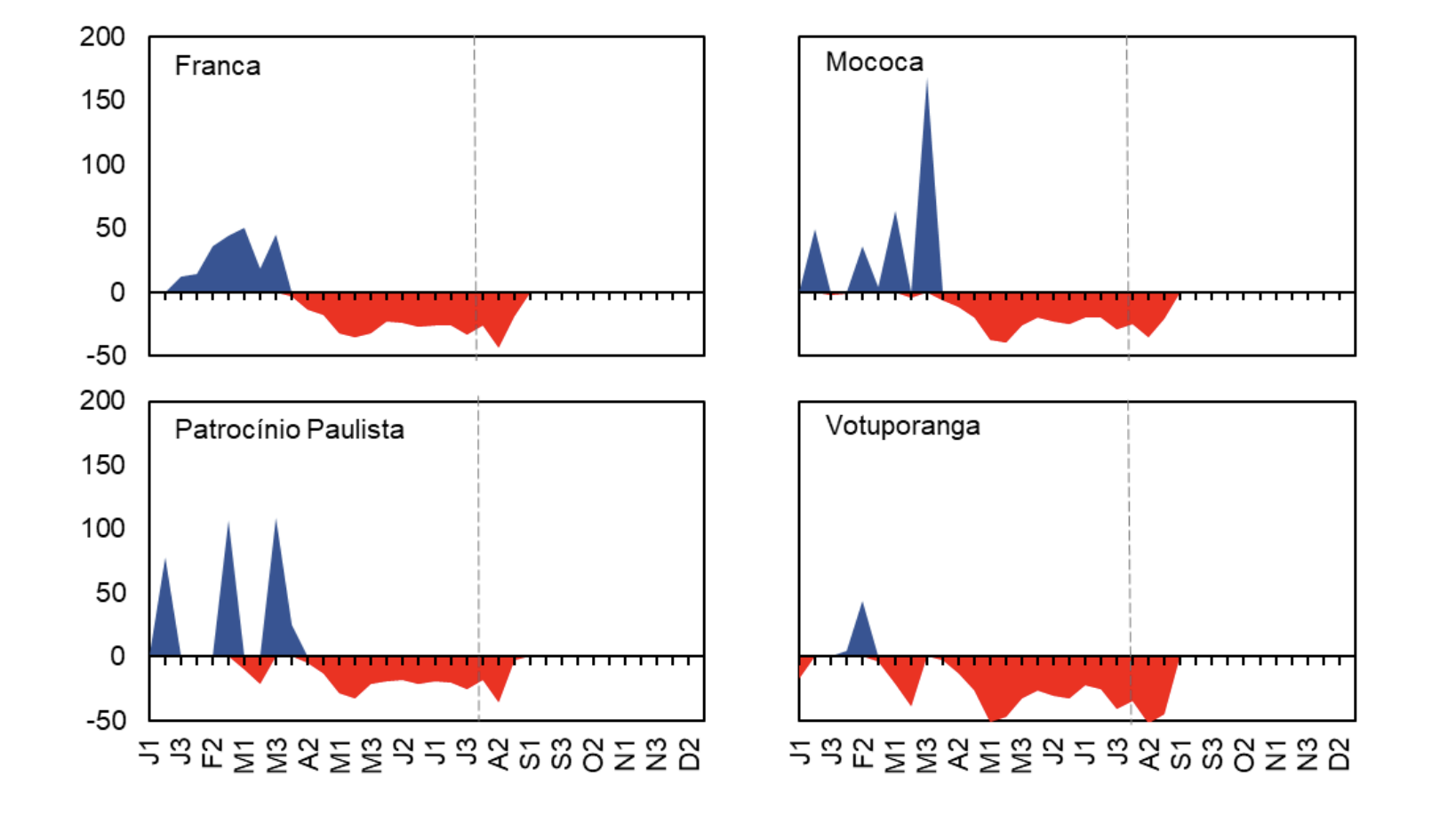 A primeira quinzena do mês de agosto, deverá ser marcada pela possibilidade de algumas chuvas irregulares, principalmente, nas regiões mais ao sul e leste do estado de São Paulo. A segunda quinzena do mês, também poderá registrar algumas chuvas mais frequentes sobre essas regiões, porém, ainda serão chuvas irregulares, mas que dependendo do volume, já poderão dar condições para abertura de algumas floradas pontuais; - Já na região mais ao norte do estado/região da Mogiana, a tendência é de que as chuvas cheguem mais para o final do mês de agosto, mas, com tendência de que sejam ainda muito irregulares; - Destaque também para o frio, uma vez que, após a ocorrência dessas chuvas, ainda poderemos ter entradas de massas de ar polar, que possam derrubar as temperaturas de maneira mais significativa, mas sem riscos, a princípio, para ocorrência de geadas. - De acordo com o modelo SPI, mantém-se uma tendência de seca sob o aspecto agrícola em todas as regiões do estado, uma vez que, mesmo com chuvas, estas deverão ocorrer de maneira ainda irregular.