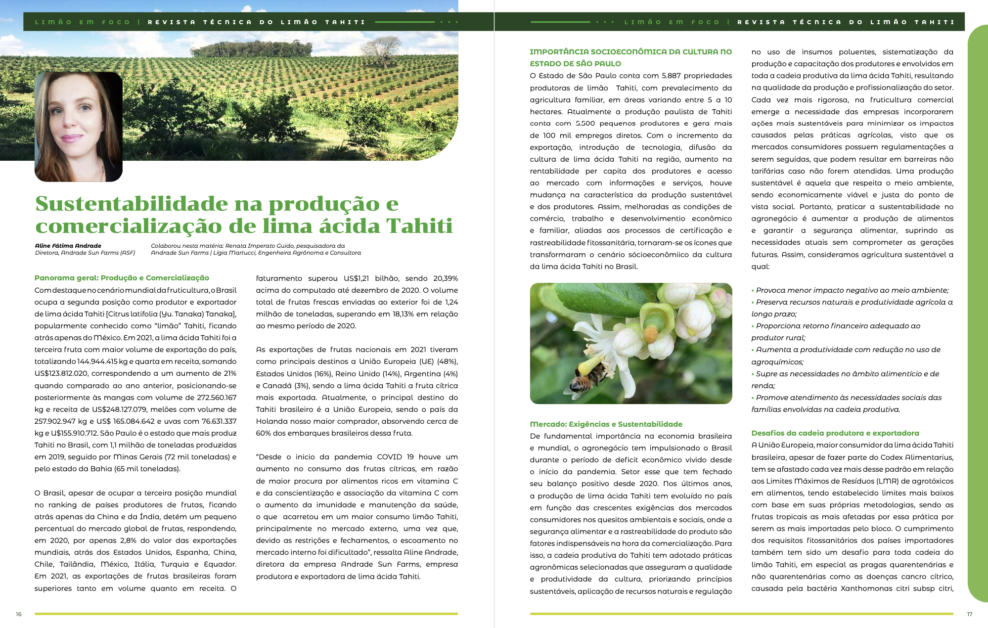“Em 2021, a lima ácida Tahiti foi a terceira fruta com maior volume de exportação do país, totalizando 144.944.415 kg e quarta em receita, somando US$123.812.020, correspondendo a um aumento de 21% quando comparado ao ano anterior”
